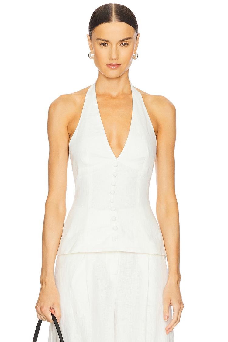 Crisp white linen with a midweight feel shapes this classic camisole featuring a flattering V-neck and sleeveless halterneck tie closure. The fitted silhouette is enhanced by decorative front buttons and a cinched elastic panel at the back for comfort and style. Falling to hip length, this versatile top pairs effortlessly for casual outings, brunch dates, or vacation days, combining minimalist elegance with breathable fabric perfect for spring and summer wardrobes.