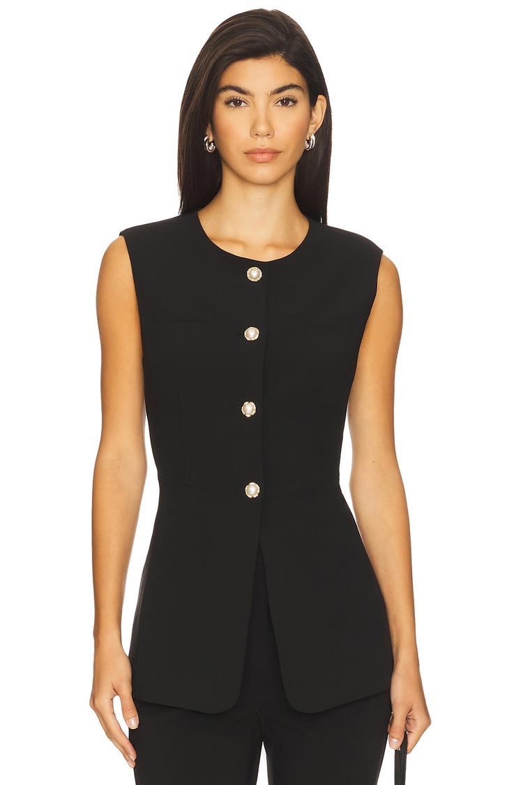 Sleek and structured, this fitted sleeveless shell top features a classic round neck and front button closure with elegant gold-tone buttons. Crafted from a midweight polyester-rayon suiting fabric, it offers a polished silhouette perfect for professional settings. The hip-length cut with a subtle front vent adds modern sophistication, making it ideal for workwear, business casual meetings, and conferences. Minimalist yet refined, this top embodies timeless business chic style for all-weather versatility.