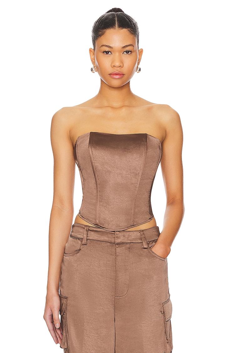 Structured boning and a smocked back panel define this fitted corset top in a rich matte brown satin polyester. The strapless, sleeveless design with a straight neckline and exposed back zipper closure creates a sleek, elegant silhouette perfect for date nights, cocktail parties, or a night out. Its cropped length offers a modern edge while the satin finish adds a touch of sophistication and glamour to your evening wardrobe.