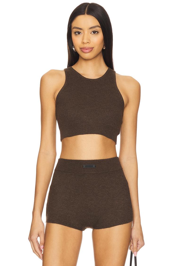 A streamlined matte brown cropped tank top crafted from a comfortable polyester-nylon knit fabric offers a fitted silhouette with wide straps and a classic crew neckline. The covered back and pullover design enhance ease and practicality. Perfectly suited for casual outings, athleisure wear, or workout sessions, this minimalist sporty piece provides versatile style and comfort for everyday wear.