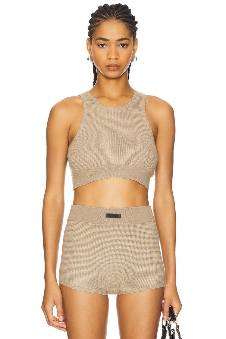 With a sleek crew neckline and wide straps, this cropped tank top features a fitted silhouette in a soft knit fabric blend of polyester and nylon. The minimalist design is complemented by a subtle logo detail at the covered back, making it a versatile piece for casual outings, workout sessions, or athleisure styling. Its breathable knit texture and lightweight feel provide comfort across all seasons, especially spring and summer. Effortlessly pair this matte beige sport tank with high-waisted bottoms for a chic, modern look that balances function and style.