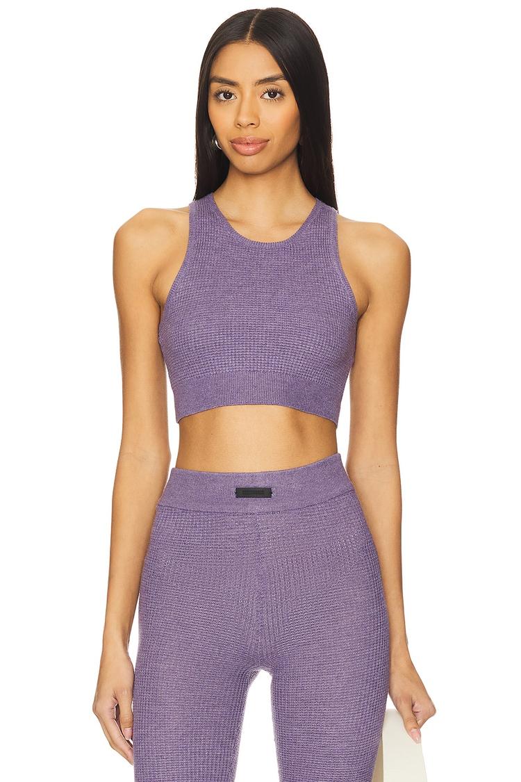 A fitted cropped tank in a rich matte purple hue crafted from breathable polyester and nylon waffle knit fabric. Featuring a classic crew neckline and wide straps, this sleeveless sport tank offers a minimalist, sporty chic vibe perfect for workouts, casual outings, and athleisure looks. The pull-on styling ensures easy wear while the covered back provides comfortable support. Versatile and stylish, it pairs seamlessly with high-waisted bottoms for a modern, active-inspired ensemble.