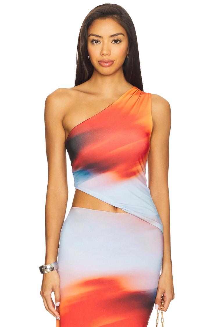 Bright matte orange blends effortlessly with light blue and black in this modern asymmetric cropped top, crafted from a midweight polyester-elastane jersey fabric. The fitted silhouette and sleeveless wide straps highlight a striking asymmetric neckline and hem, creating a bold, sexy look perfect for spring and summer. Ideal for casual days, brunches, or night outs, this pullover top brings a trendy, contemporary edge to your wardrobe.