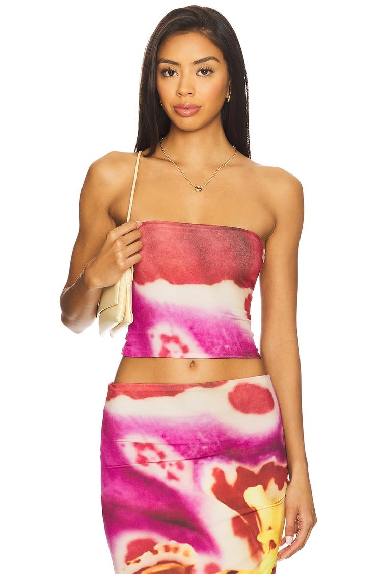 Vibrant and eye-catching, this fitted bandeau cropped top showcases an abstract all-over print in bright pink, red, white, and yellow hues. Crafted from a midweight polyester-elastane jersey, it offers a comfortable stretch fit perfect for warm spring and summer days. The strapless neckline and sleeveless design highlight a modern, trendy aesthetic that pairs effortlessly with casual outings, brunches, or night out occasions. Slip it on for a bold street style statement that balances playful color and sleek silhouette.