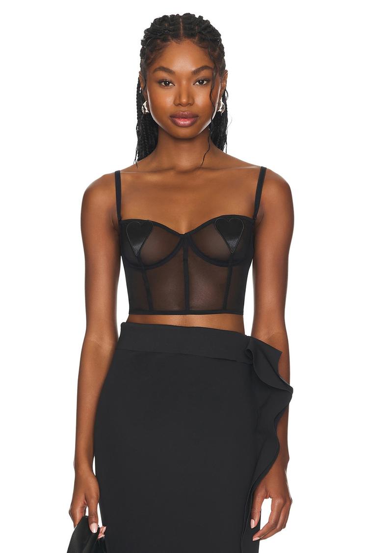 Sheer matte black bralette with a fitted bustier silhouette and sweetheart neckline exudes modern chic appeal. Adjustable spaghetti straps and an exposed back zipper closure ensure a perfect fit. Crafted from a smooth nylon-elastane blend, this cropped piece features underwire cups with a subtle heart design overlay, adding a flirty edge. Ideal for date nights, girls' nights, and night outs, it layers effortlessly for a bold, sexy look during spring and summer evenings.
