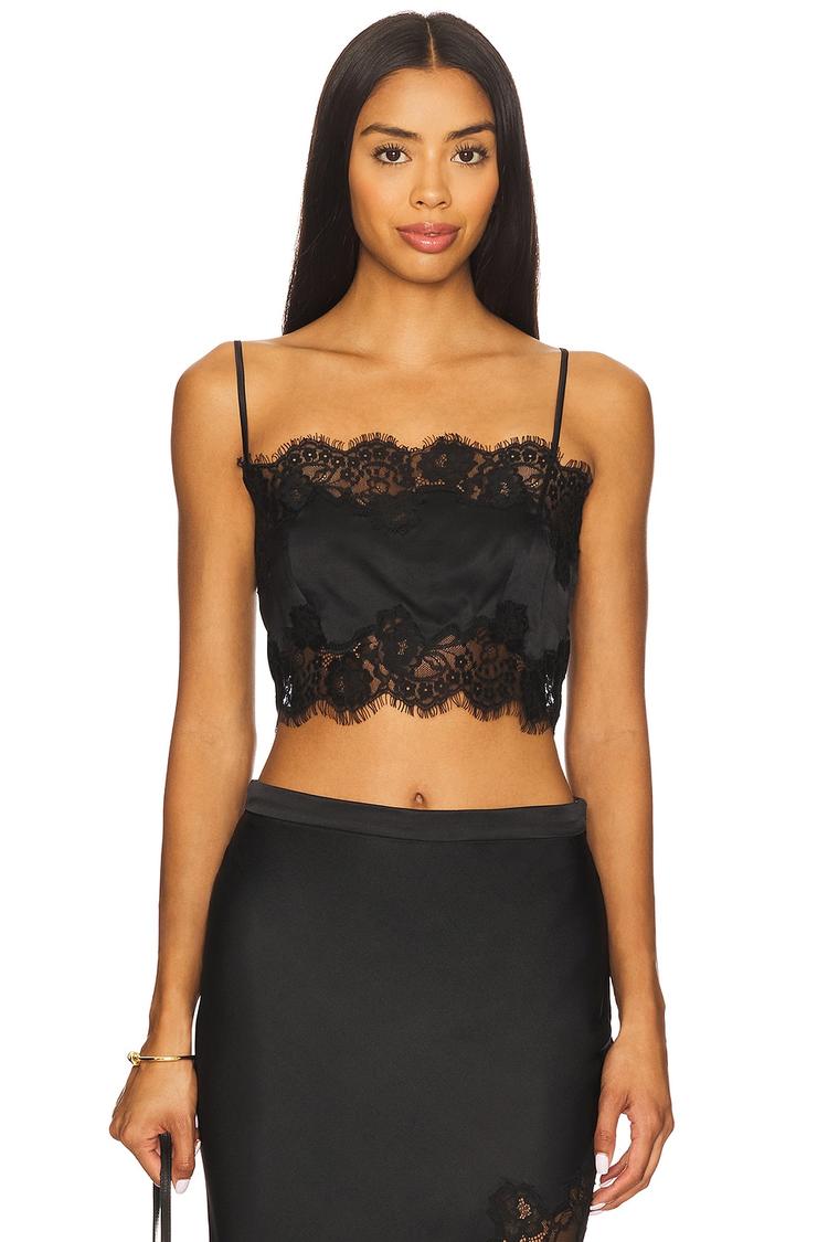 Delicate lace trim adorns the hem and neckline of this fitted, cropped bandeau top crafted from a luxurious blend of silk, cotton, lyocell, and nylon. Its matte black hue and straight neckline pair elegantly with adjustable spaghetti straps, making it a perfect choice for spring and summer occasions. Ideal for casual outings, brunches, date nights, or evening events, this chic and sexy top offers a refined silhouette with a hidden side zipper closure for a sleek finish.