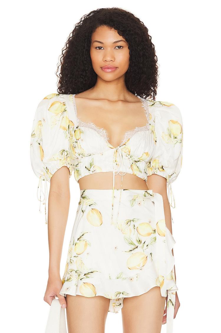 Delicate lace trim and puffed balloon half sleeves elevate this romantic cropped top, crafted from soft sateen fabric for a fitted silhouette. The sweetheart neckline and back tie closure with elastic straps add charming details, while the all-over yellow and green floral print on a matte white base evokes spring and summer vibes. Ideal for casual outings, brunches, and date nights, this chic crop top blends bohemian flair with modern elegance, making it a versatile piece for warm-weather wardrobes.