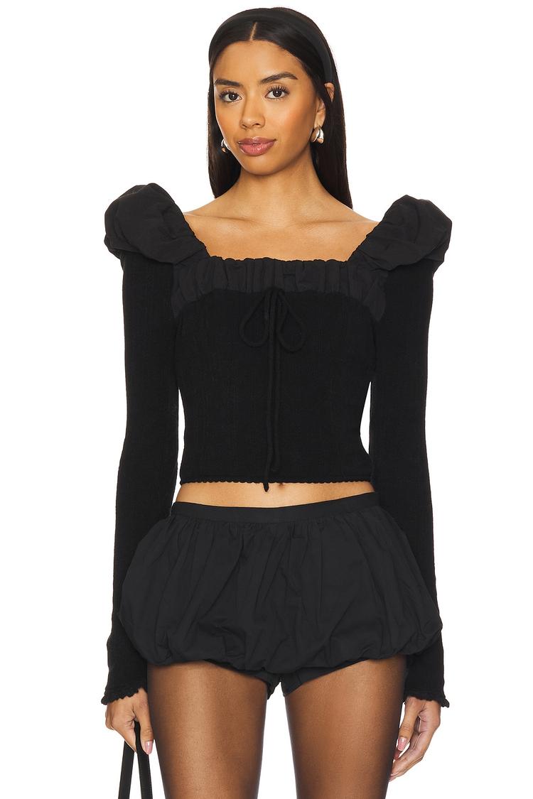 Elegant and fitted, this cropped top features a square neckline and dramatic puffed sleeves with ruffle detailing along the sleeves, neck, and front tie closure. Crafted from a midweight knit blend of rayon, polyester, nylon, spandex, and cotton, it offers both comfort and a flattering silhouette. Ideal for layering in autumn, winter, or spring, this romantic and chic top suits casual outings, brunches, date nights, and stylish evenings out. The pull-on design with front tie accents adds a trendy touch to this versatile piece.