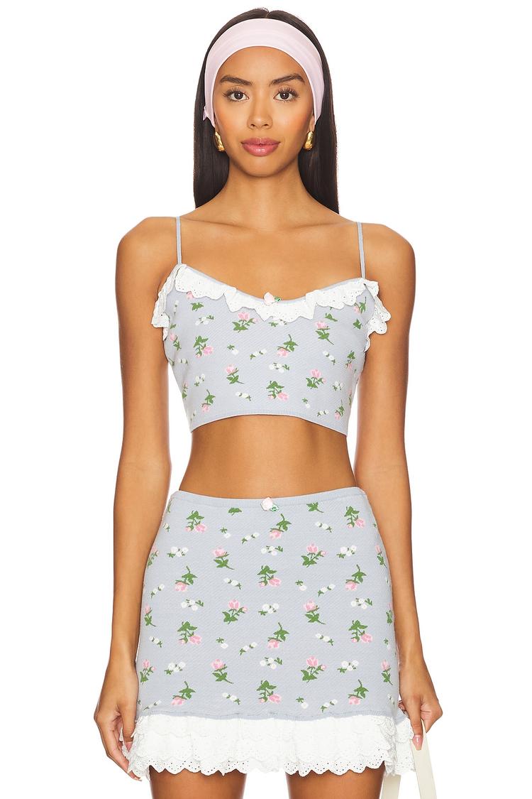 Softly fitted with delicate spaghetti straps and a sweetheart neckline, this cropped knit top showcases a light blue base adorned with an all-over floral pattern. The white ruffled trim along the neckline and hem adds a charming bohemian touch. Crafted from a comfortable viscose-polyester-spandex blend, it offers a breathable feel ideal for spring and summer. Adjustable straps enhance fit versatility. Perfect for casual outings, brunch dates, or vacation days, this top pairs effortlessly with high-waisted skirts or shorts for a fresh, feminine look.