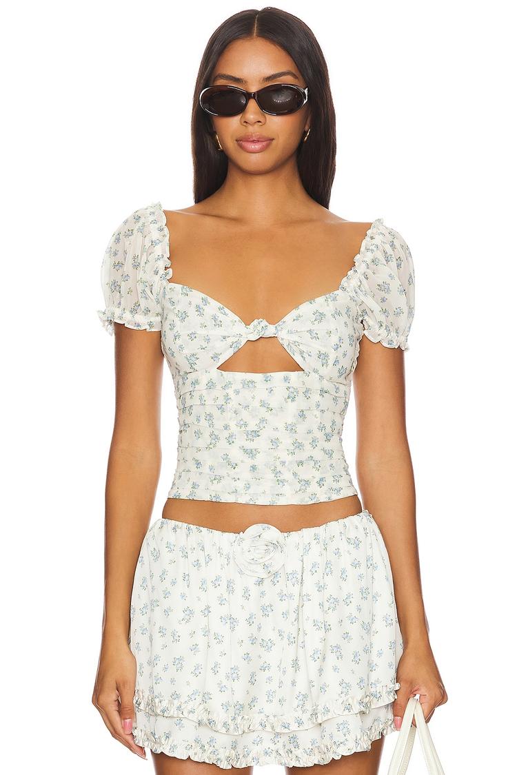 Delicate chiffon fabric and a fitted corset silhouette define this romantic waist-length top featuring a charming square neckline and half puffed sleeves with smocked elastic for a feminine finish. The all-over blue floral print on white creates a fresh spring-summer vibe, accented by ruffled hems and sleeves. A distinctive front cut-out with a knotted detail and boned sides enhance shape and style. Ideal for casual outings, brunch dates, or girls' nights, this top blends chic bohemian charm with modern design for versatile everyday elegance.