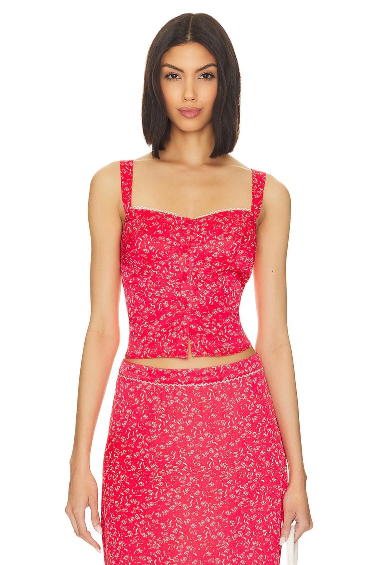 Bright red floral eyelet embroidery and delicate button-front closure define this chic camisole top. Crafted from soft viscose with contour dart bust for a fitted silhouette, it features wide straps and a flattering square neckline. The cropped length makes it perfect for pairing with skirts or high-waisted pants. Ideal for casual days, brunch outings, or romantic date nights during spring and summer, this versatile piece blends feminine charm with trendy details.