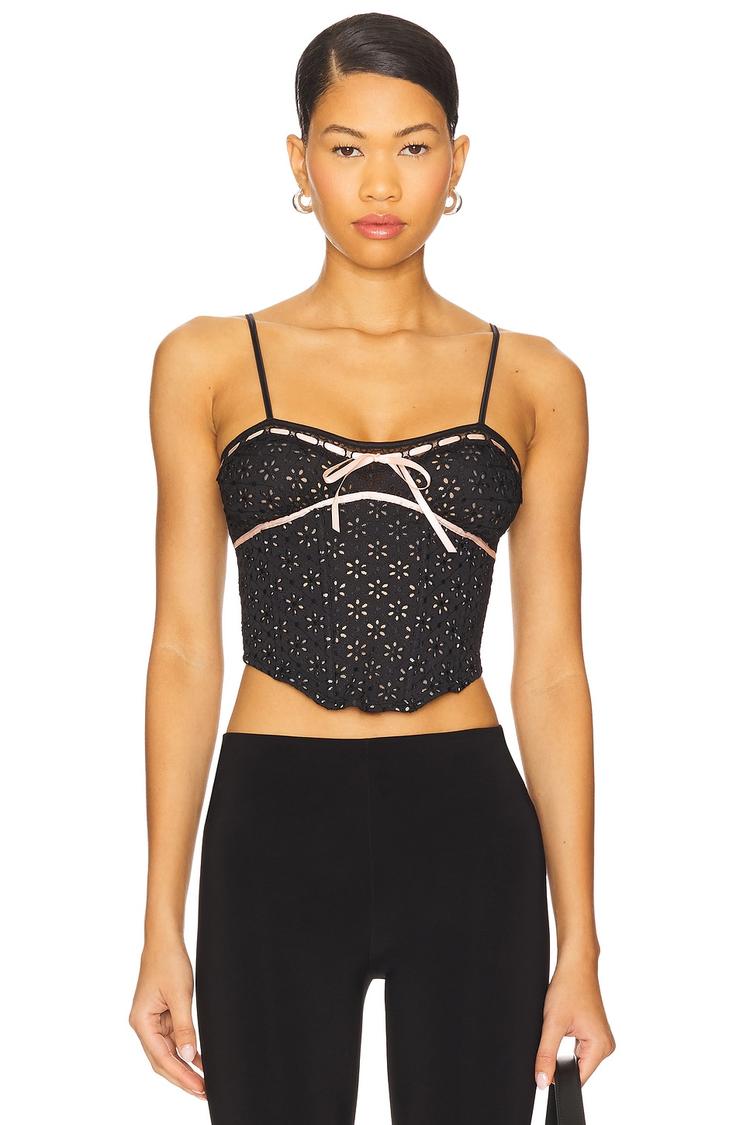 Delicate eyelet embroidery and satin ribbon accents define this fitted cropped corset bralette, crafted from smooth polyester for a sleek silhouette. Adjustable spaghetti straps and boned construction offer structure and comfort, while the hook and eye back closure ensures a secure fit. Its matte black base with off-white satin details creates a modern, sexy vibe perfect for spring and summer. Ideal for casual outings, brunches, or night outs, this versatile piece elevates your wardrobe with trendy, feminine charm.