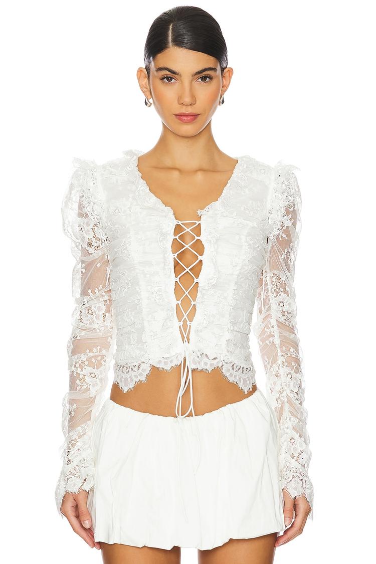 Delicate white lace with intricate ruffles and a ruched bodice define this fitted cropped corset top. Featuring long sheer sleeves and a deep V-neck with a front lace-up tie closure, it blends romantic elegance with chic style. Crafted from lightweight cotton-nylon lace, this top is perfect for spring and summer occasions such as brunch, date nights, or evening outings. Its covered back and lace trim add timeless sophistication to your wardrobe.