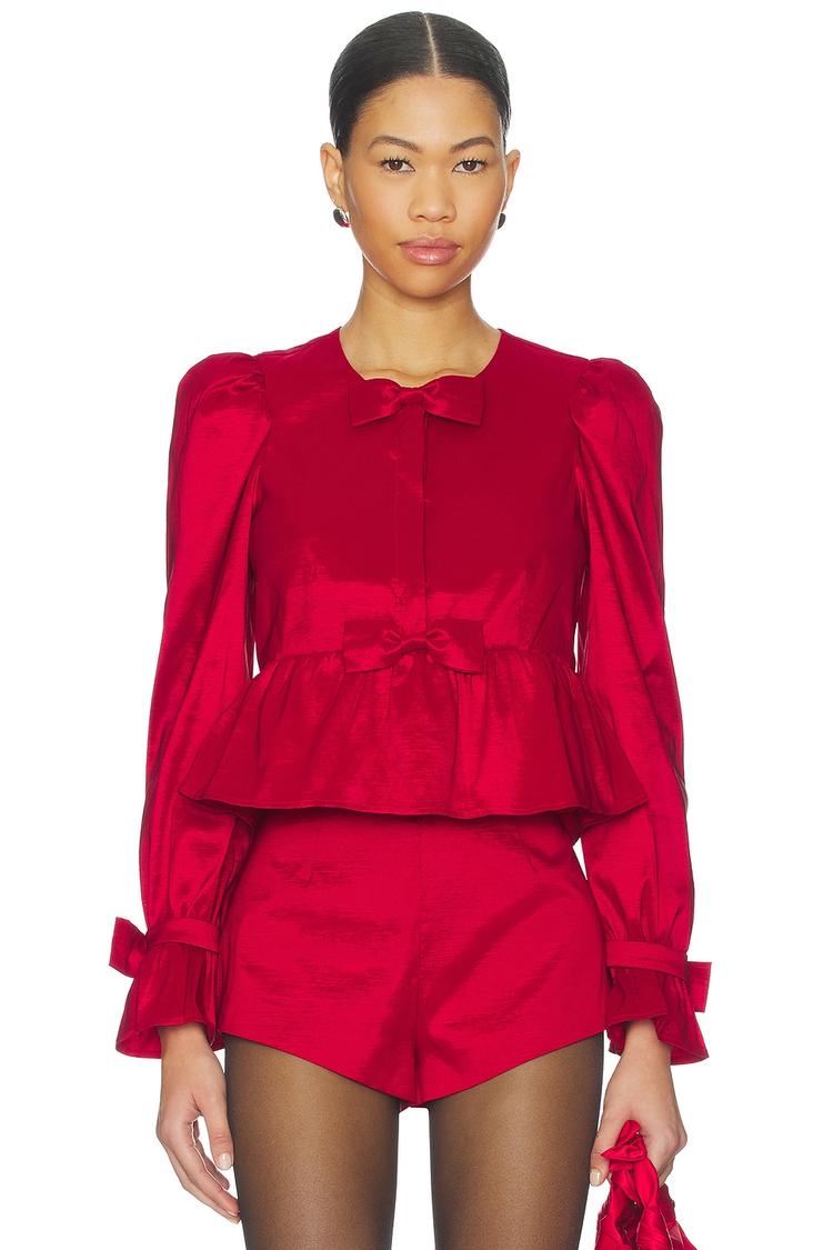 Bright red lightweight taffeta shapes this elegant peplum top with a fitted silhouette that flatters the darted waist. Featuring a classic round neck and long regular sleeves, it’s detailed with charming bow accents at the cuffs and waist, plus a front button closure for a polished finish. Perfect for cocktail evenings, date nights, or any sophisticated night out, this chic piece adds a bold pop of color and refined texture to your wardrobe.