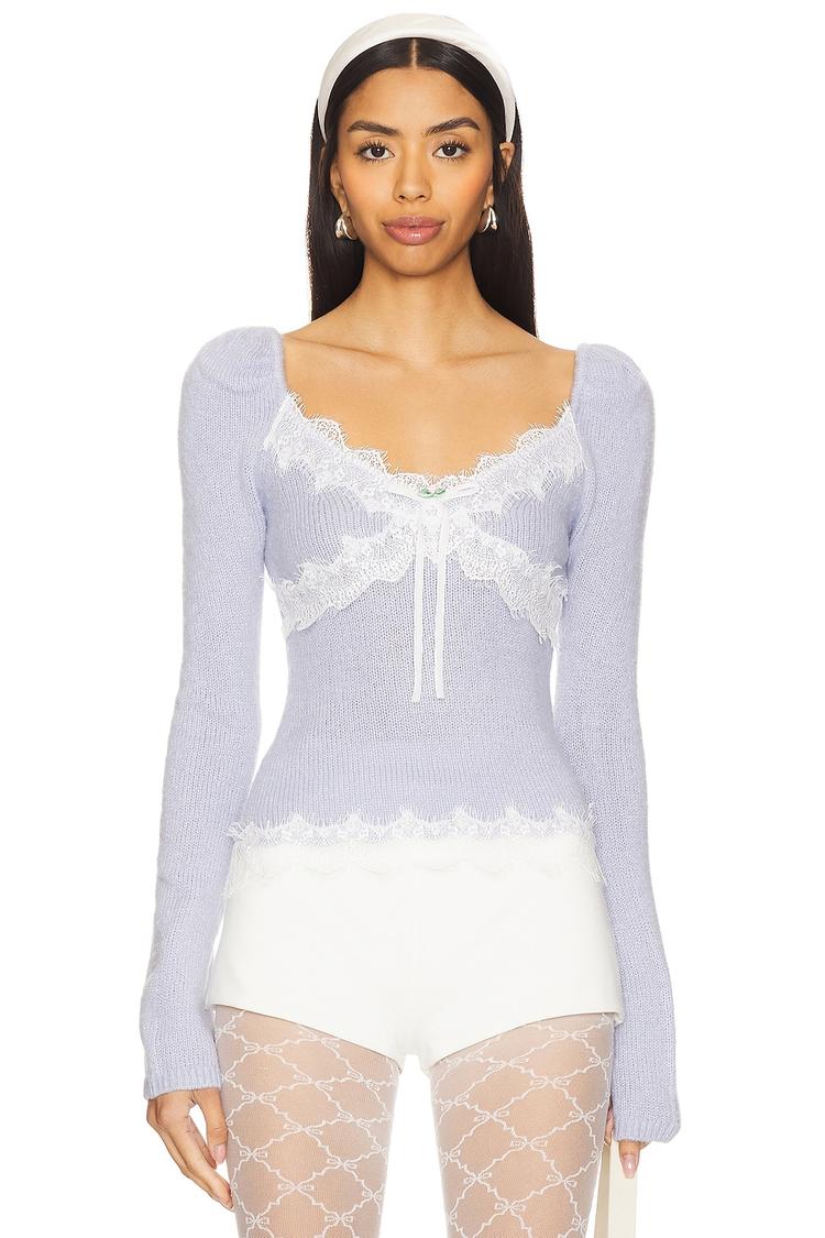 Lavender Rosaleen Top from For Love & Lemons, a delicate knit that feels as romantic as it looks. Crafted from a soft blend (58% acrylic, 33% nylon, 9% wool), this cropped long-sleeve top features a sweetheart neckline with scalloped white lace trim, a dainty front bow, and lace edging along the hem for a feminine finish. The silhouette hugs the body with a flattering fitted feel, while the open back adds a hint of allure. Team with high-waisted shorts or a flowing skirt for brunch, date night, or resort-ready style—elevated, versatile, and effortlessly chic.