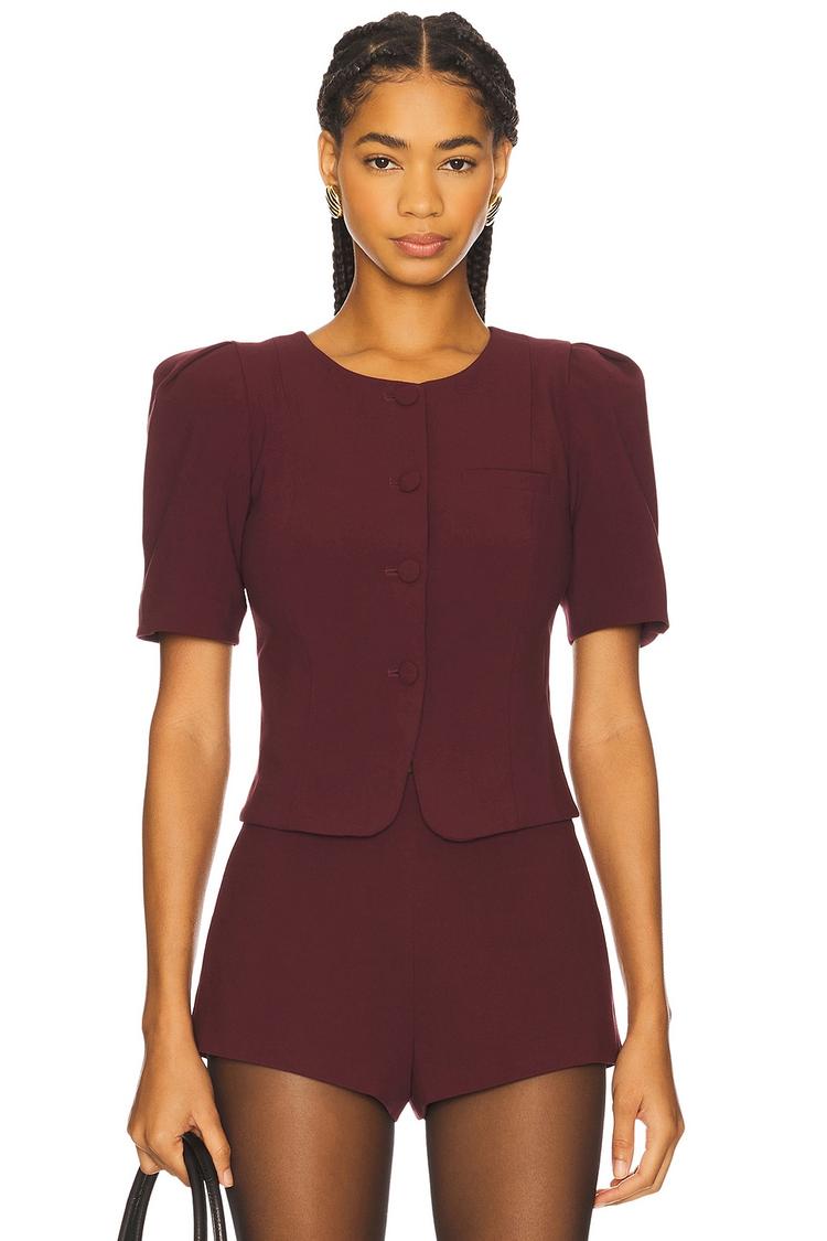 Matte burgundy polyester blend fabric shapes this fitted blouson top with a classic round neck and structured half sleeves. The hip-length silhouette features a front button closure and a subtle welt pocket, exuding elegant business chic vibes perfect for workwear, business casual settings, or stylish brunch outings. Its timeless design and comfortable fabric mix make it versatile for all seasons, balancing professional polish with feminine flair.