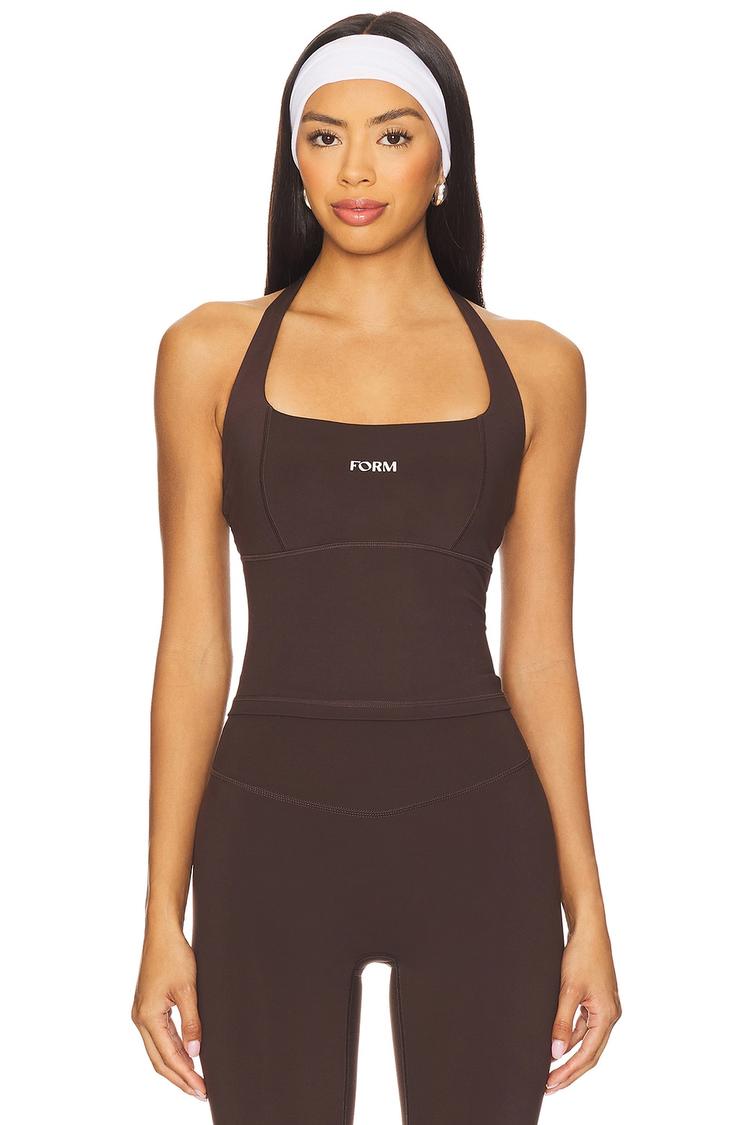 Sleek and supportive, this fitted halter tank top features a matte dark brown hue crafted from midweight polyester-spandex fabric for comfortable stretch and durability. The pull-on style and built-in shelf bra with padded cups provide functional support while the halter neckline and strapless sleeves create a sporty chic silhouette. Perfectly suited for athleisure, workouts, and casual wear, its minimalist design is elevated by a subtle white front logo. A versatile waist-length top ideal for all seasons and active lifestyles.