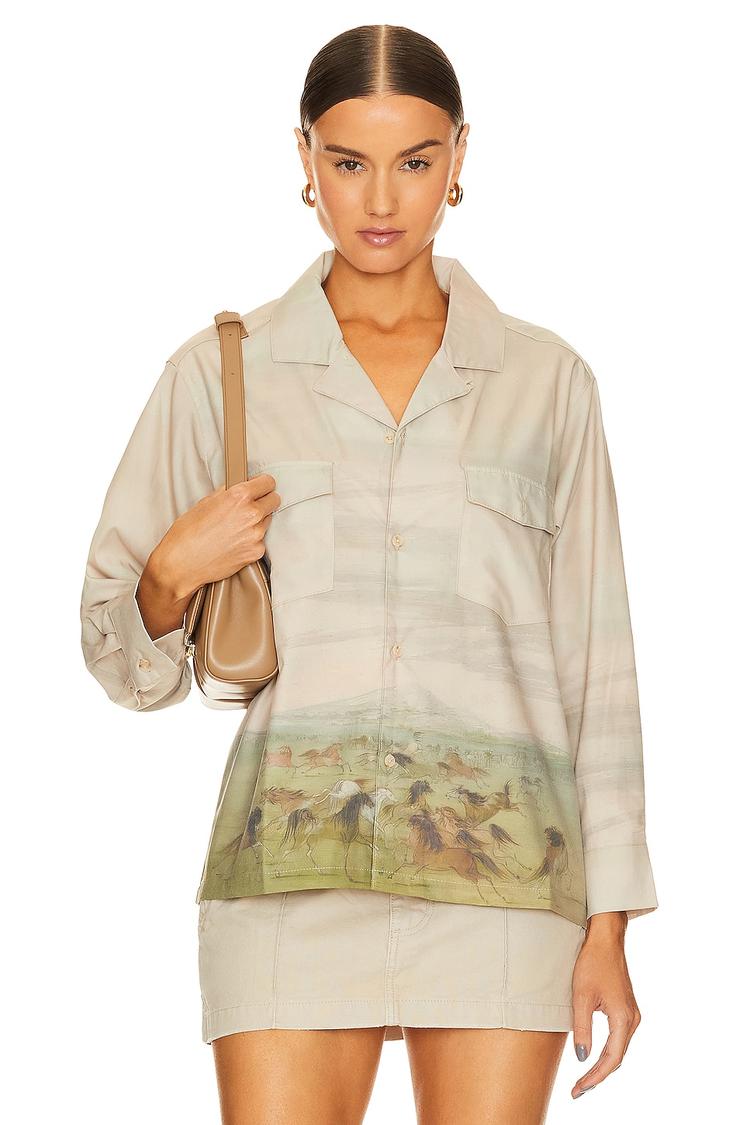 Matte satin fabric and a relaxed fit define this Shacket with a hip-length hem and long regular sleeves. Featuring a modern lapel neckline and front button closure with button cuffs, it offers casual chic style. The graphic print at the hem adds an artistic touch in green, brown, and black shades against a beige base. Perfect for casual outings, workwear, or brunch dates, this versatile piece blends comfort with contemporary flair.