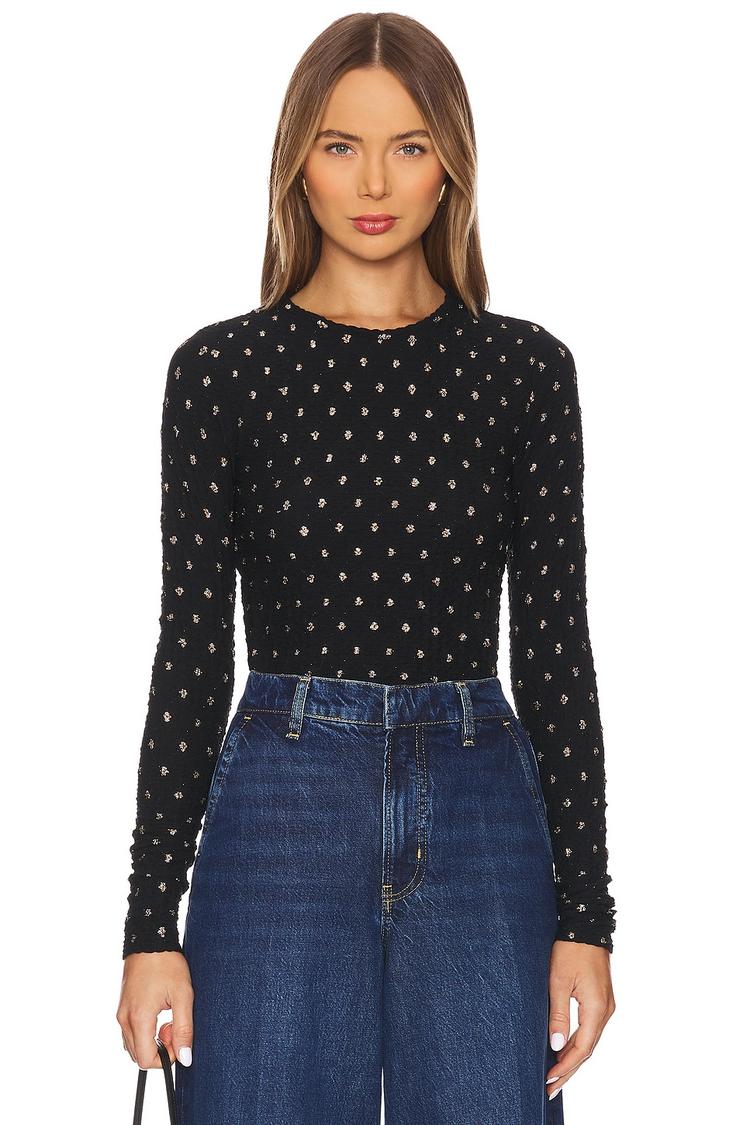 A fitted shell crafted from stretch mesh fabric offers a sleek silhouette with long sleeves and a classic round neck. The matte black base is adorned with metallic silver polka dots all over, adding a subtle shimmer perfect for autumn to spring wear. This hip-length top pulls on easily, making it a versatile choice for casual outings, brunches, or night outs where chic and modern style is desired. The delicate dotted pattern and breathable mesh fabric create an effortlessly sexy vibe for layering or wearing solo.