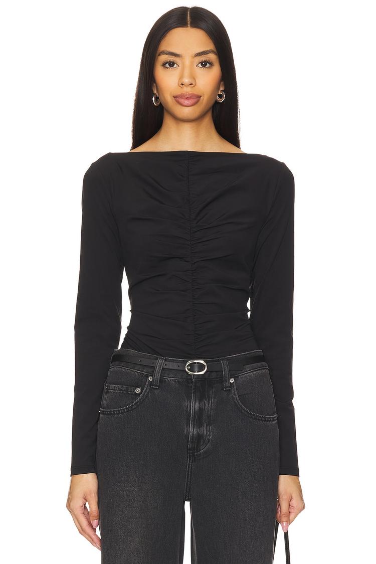 Sleek and fitted, this matte black long sleeve shell features a sophisticated square neckline and subtle ruching detail at the front center that flatters the silhouette. Crafted from a stretchy polyester-elastane jersey fabric, it offers comfortable all-weather wearability. With its hip length and minimalist modern style, this pullover top is versatile for casual days, workwear, business casual settings, and brunch outings. The covered back and regular sleeves add to its polished yet understated look, making it a chic essential for a refined everyday wardrobe.