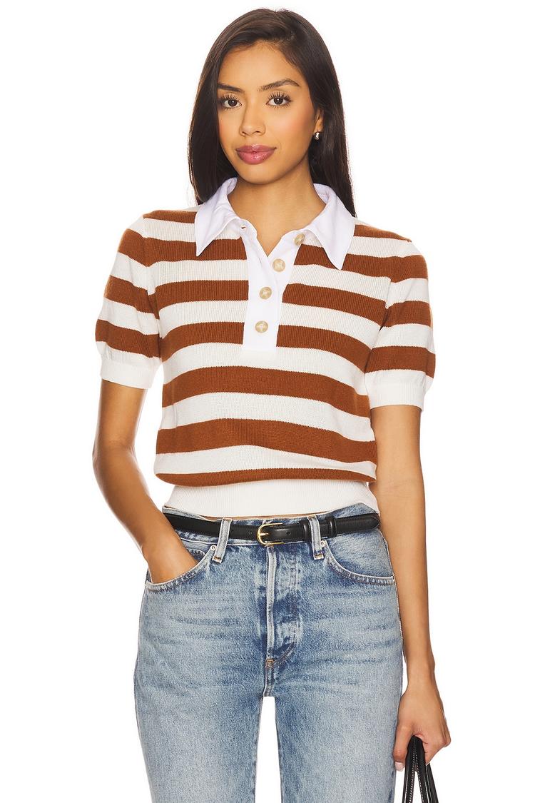 Warm brown and crisp white stripes define this fitted polo top crafted from a lightweight knit blend of cashmere, cotton, nylon, and linen. Featuring a classic polo collar and half sleeves with ribbed trims on the collar, cuffs, and hem, it offers a timeless preppy silhouette. The partial front button closure adds subtle refinement. Ideal for casual days, business casual settings, or weekend brunches, this hip-length top blends comfort and elegance effortlessly across spring, summer, and autumn seasons.