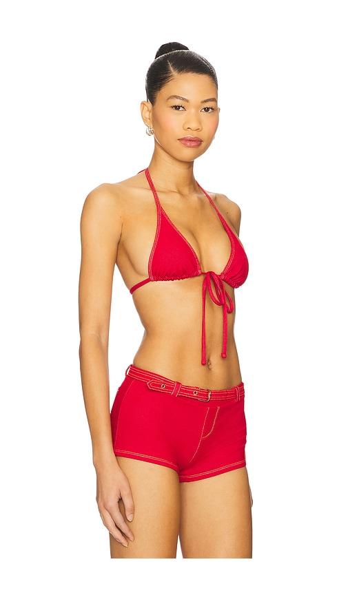 FRANKIES BIKINIS PARADISE DENIM BIKINI TOP IN RED.