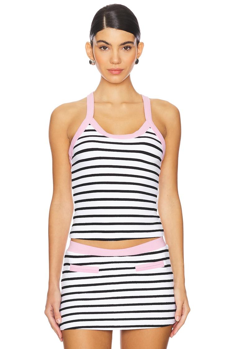Effortless coastal-chic in a navy-and-white striped Velma Terry Tank. Crafted in stretchy nylon with a hint of spandex for a flattering, close fit, this cropped tank features a playful pink trim at the scoop neckline and armholes, plus a sporty racerback for easy movement. The terry-cloth texture adds casual, beach-ready appeal, while the pull-on silhouette keeps styling quick and comfy. A versatile piece that pairs perfectly with a mini skirt or denim shorts for brunch, poolside hangs, or a sunlit vacation look. Lightweight, flattering, and ready for everyday adventures.
