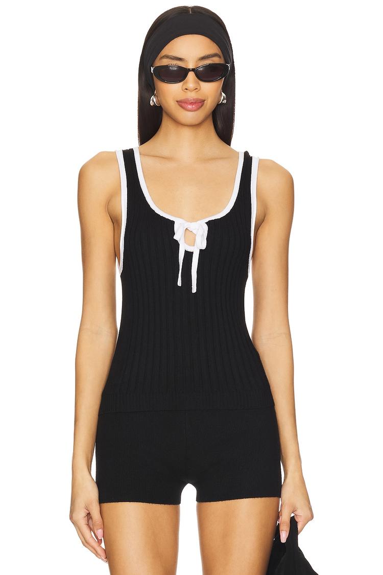 Ribbed jersey fabric and a fitted silhouette define this sleek black tank with contrasting white trim and a charming bow tie at the neckline. Its sleeveless, wide strap design and U-neck create a minimalist yet chic look, perfect for casual outings, everyday wear, or brunch with friends. The waist-length cut ensures versatile styling options, combining comfort with a subtle statement detail for a polished, effortless appeal.