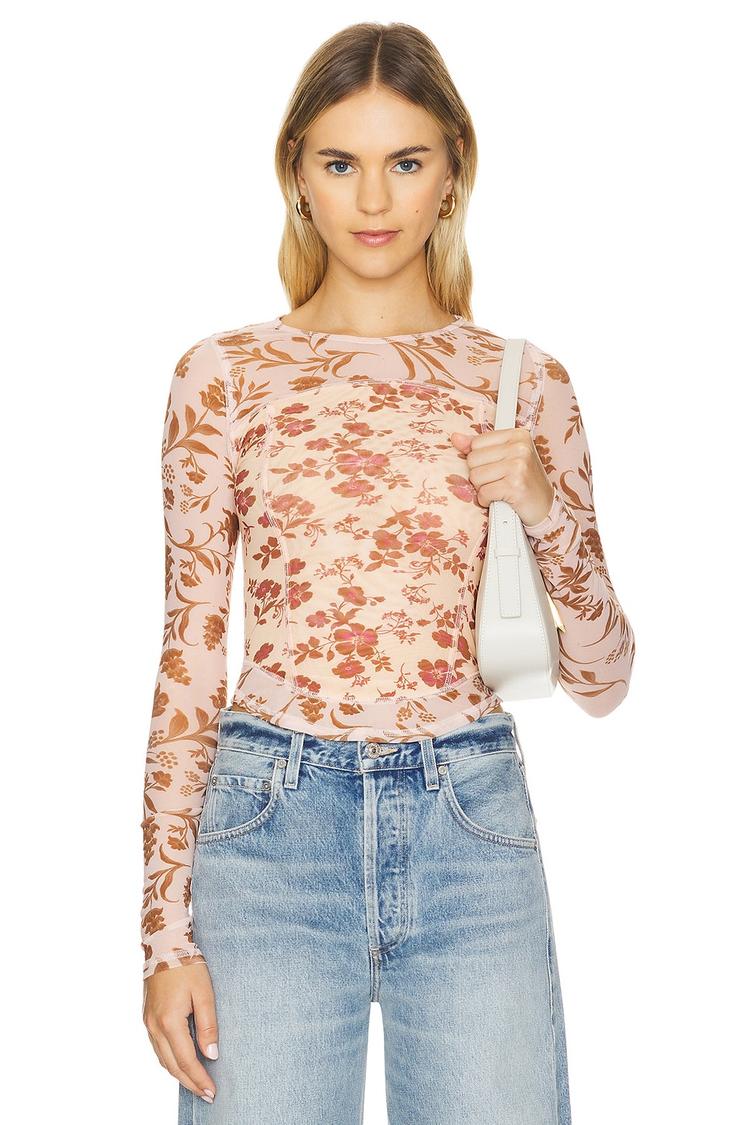 Delicate floral motifs in matte rust adorn a sheer, lightweight nylon mesh top with a slim fit and classic crew neckline. This waist-length shell features long regular sleeves and a pullover style, creating a trendy bohemian vibe perfect for casual days, brunch dates, or streetwear looks in spring through autumn. The semi-sheer fabric adds an airy, breathable feel while maintaining a sophisticated silhouette.