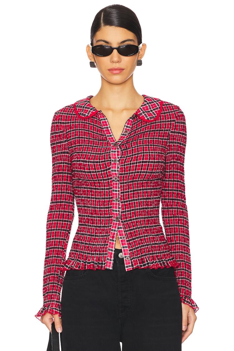 red checkered cardigan