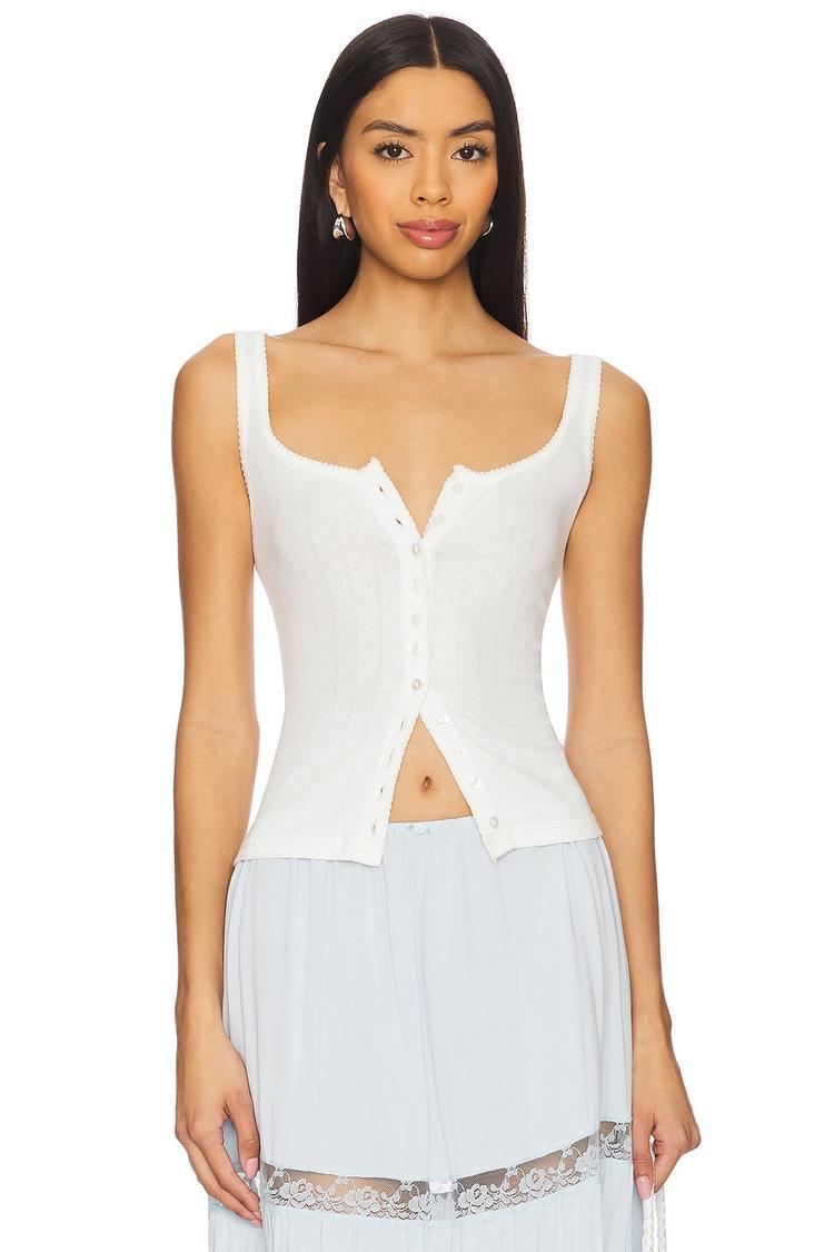 Lightweight white jersey fabric and a fitted silhouette define this End Game Pointelle Tank. Featuring a square neck and wide straps, this sleeveless tank closes with a front button placket, offering a casual chic vibe perfect for spring and summer days. Its waist-length cut and covered back make it an ideal pick for everyday wear, brunch dates, or relaxed casual outings. This tank combines comfort with subtle style, making it a versatile staple in any warm-weather wardrobe.
