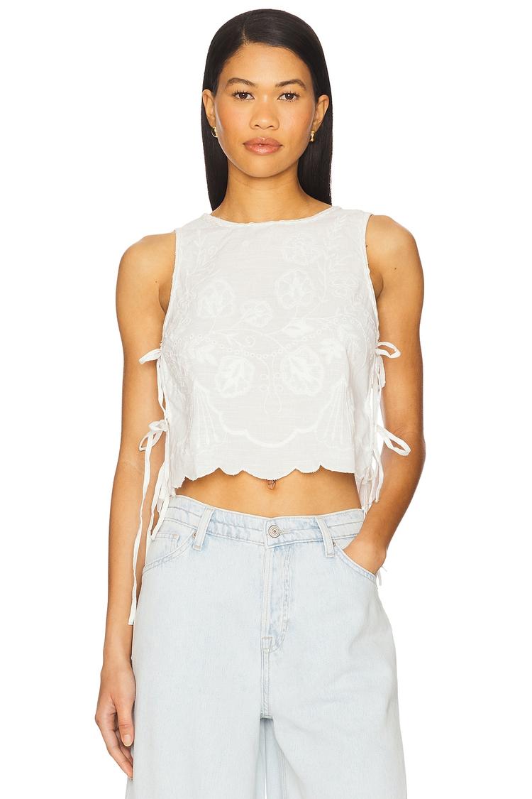 Lightweight cotton with tonal embroidery and side tie closures define this relaxed cropped tank top. The scalloped hem and keyhole back button add subtle feminine detail, making it ideal for sunny spring and summer days. Perfect for casual outings, brunch with friends, or a laid-back vacation vibe, this bohemian-inspired piece brings effortless style and comfort to your warm-weather wardrobe.