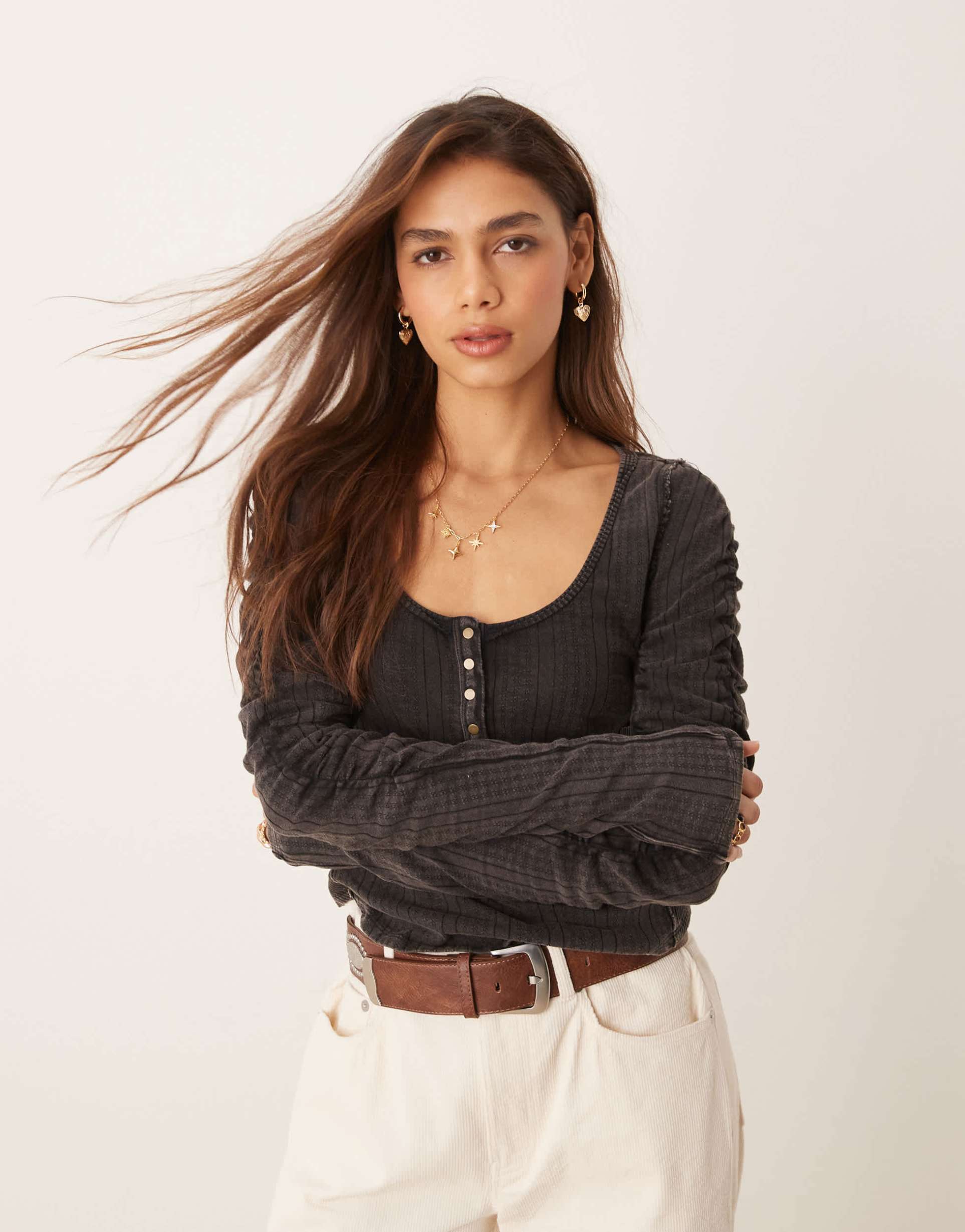 FREE PEOPLE RUCHED SLEEVE POINTELLE HENLEY TOP IN WASHED BLACK