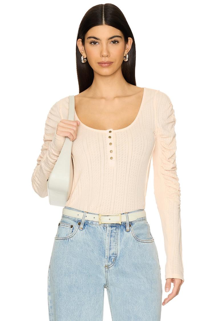 Soft matte cream jersey fabric and a slim fit define this Henley top with ruched long sleeves and a flattering U-neckline. The partial front snap button closure adds subtle detail to the waist-length silhouette, making it an effortlessly stylish choice for casual days, everyday wear, or weekend brunches. Crafted from a comfortable cotton-polyester blend, it offers midweight warmth suitable for all seasons. Its minimalist yet chic design pairs perfectly with denim or skirts for a versatile, timeless look.