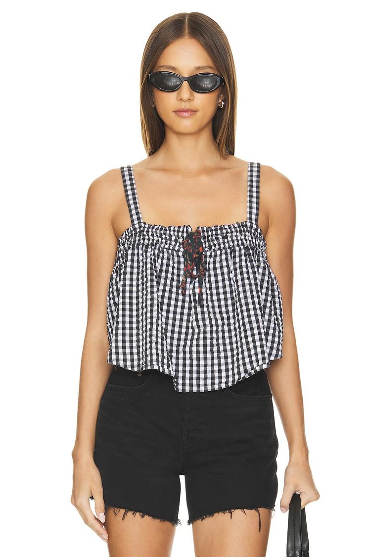 Soft cotton fabric and a relaxed fit define this Bohemian-inspired cami with a classic black and white checkered pattern. Featuring a square neckline and delicate spaghetti straps, the smocked bust with a floral tie-up ribbon adds charming detail. Its waist-length hem makes it perfect for pairing with shorts or skirts. Ideal for casual outings, brunches, or vacation days, this top combines comfort and style effortlessly for warm spring and summer seasons.