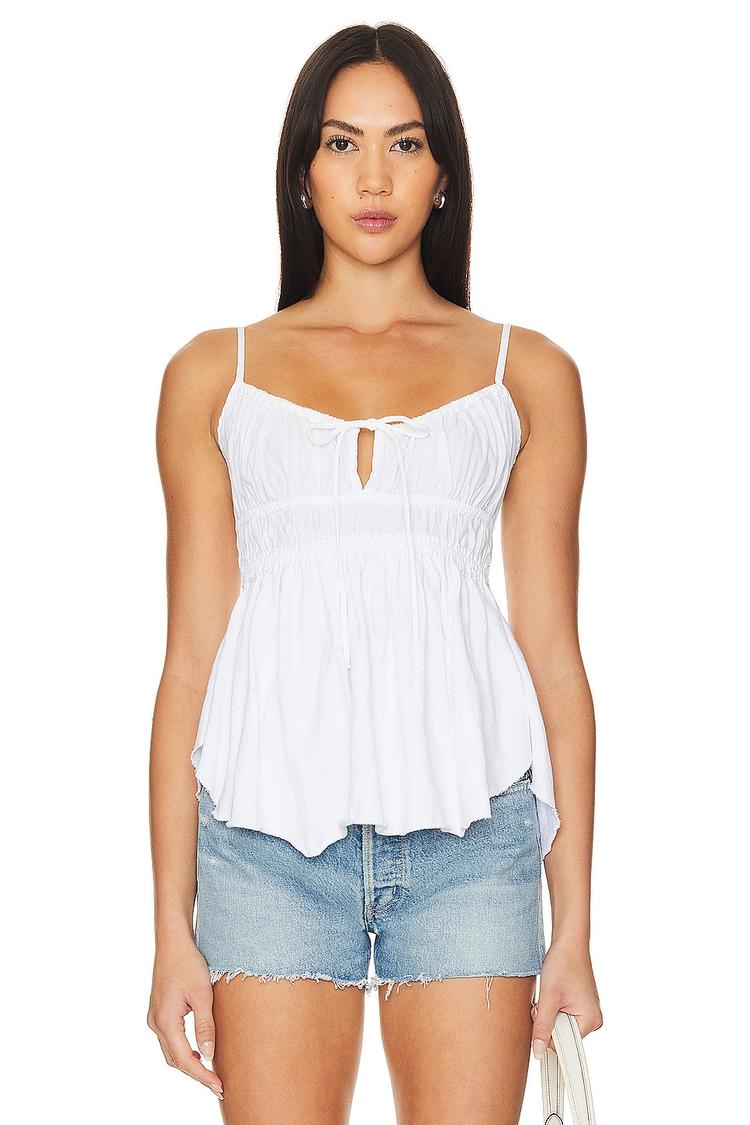 Soft cotton fabric and a relaxed fit combine in this hip-length tank with delicate spaghetti straps and a charming keyhole neckline featuring a tie-up closure. The raw-cut hem adds a touch of bohemian flair, making it an ideal choice for warm spring and summer days. Whether you're heading out for brunch, enjoying a casual vacation, or running errands around town, this breathable white tank offers comfort and effortless style with its subtle ruffle detail at the hem.
