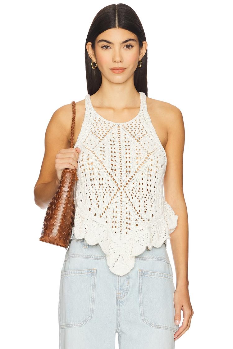 Light and airy, this Off-White crochet tank features a loose fit with wide straps and a round neckline, perfect for warm weather. The midweight open-knit fabric offers a semi-sheer look with an asymmetrical scalloped hem that adds a delicate, bohemian touch. Ideal for casual outings, brunches, or vacation days, it blends relaxed comfort with stylish detail. The slip-on design ensures easy wear, making it a versatile piece for spring and summer wardrobes.