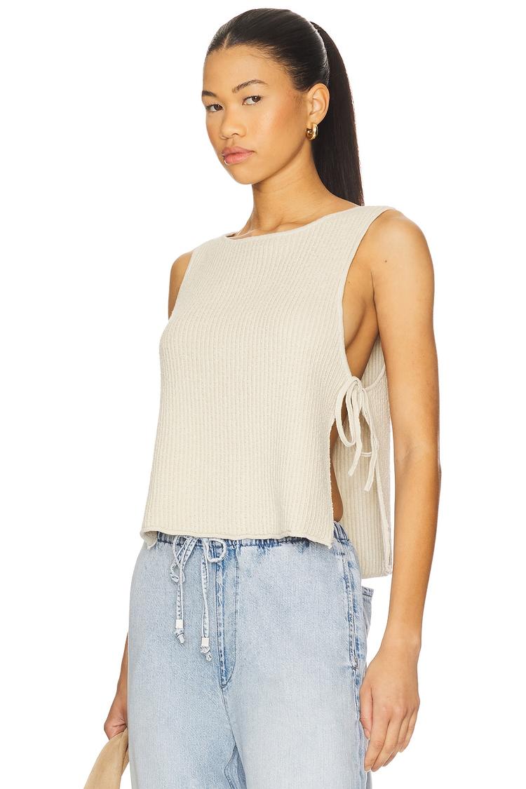 Soft cotton knit in a relaxed fit brings ease and style to this sleeveless tank top featuring a round neckline and wide straps. The hip-length hem and open back with side tie-up closures add a breezy, bohemian vibe perfect for casual outings, brunch dates, and everyday wear during spring and summer. Its minimalist solid beige tone blends effortlessly with denim or layered looks for a versatile warm-weather essential.