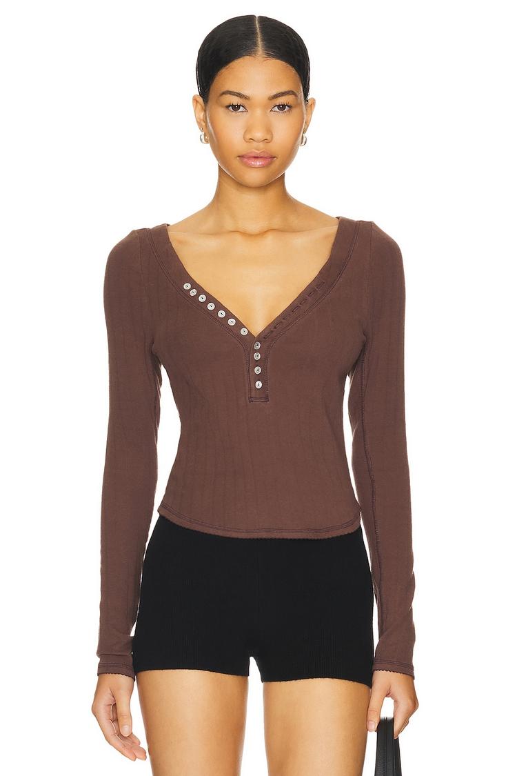 Soft ribbed cotton with a touch of elastane creates a fitted silhouette in this Henley top featuring a flattering V-neck and partial front button closure. Its long sleeves and waist-length cut offer cozy coverage for cooler seasons. The matte brown hue adds a warm, earthy tone perfect for casual outings, brunch dates, or everyday wear. With minimalist styling and a comfortable stretch fabric, this versatile piece blends casual chic with timeless appeal for effortless layering or standalone style.