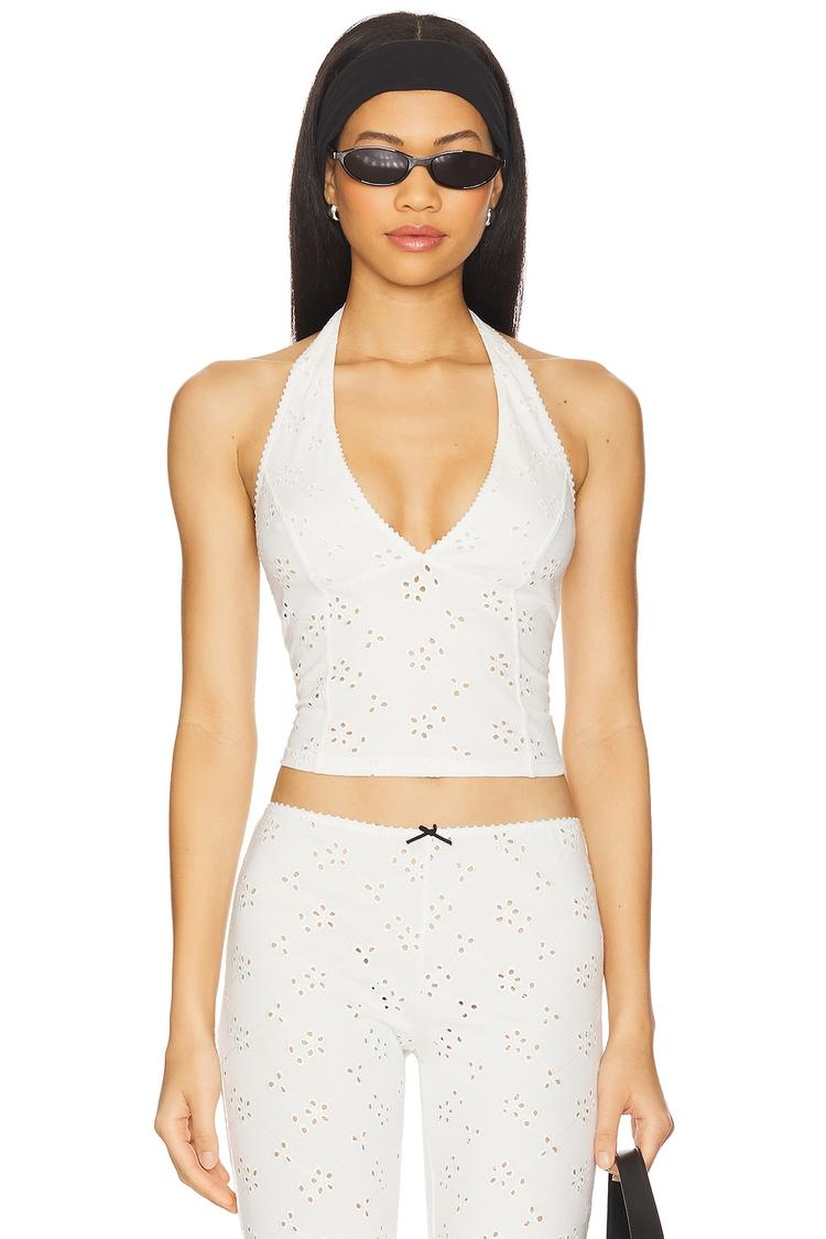 Lightweight eyelet fabric and a fitted silhouette define this ivory camisole with a halter neck and strapless styling. The open back adds a breezy touch, while the waist-length cut creates a flattering shape. Perfect for casual days, brunches, or vacation getaways, this cotton-polyester blend top combines comfort and bohemian charm with casual chic vibes.