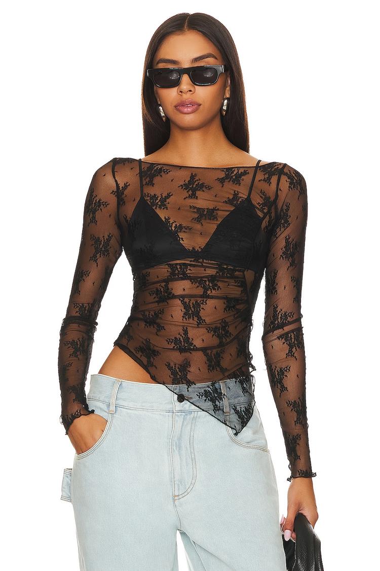 Sheer black floral lace with an asymmetric hem defines this slim-fit shell top, featuring a square neckline and long regular sleeves. Crafted from a stretchy blend of polyamide and elastane, it hugs the waist-length silhouette gracefully. This trendy piece is perfect for casual outings, brunch with friends, or a night out, bringing a bold yet bohemian edge to your wardrobe. The covered back and pullover closure add ease to this statement layering essential.