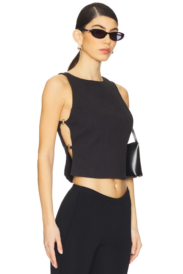 Sleek and modern, this fitted cropped tank top features a classic crew neckline and sleeveless wide straps for a clean silhouette. Crafted from a midweight cotton-linen-rayon blend with a touch of elastane, it offers breathable comfort and subtle stretch. The standout open sides with dual silver buckle details and an exposed back zipper add edgy sophistication. Ideal for spring and summer, this versatile top transitions effortlessly from casual outings and brunch dates to stylish streetwear looks.