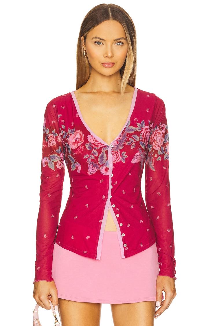 Lightweight chiffon fabric and a fitted silhouette bring romantic charm to this shell top featuring a wrap-around floral print in vibrant red and pink hues. The long regular sleeves and V-neckline enhance its chic and bohemian appeal, with a front button closure adding delicate detail. Perfect for spring and summer, this hip-length top seamlessly transitions from casual brunches to intimate date nights, making it a versatile and stylish addition to your wardrobe.