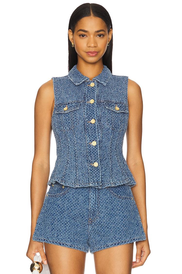 Textured midweight denim shapes this fitted sleeveless top featuring a charming Peter Pan collar and front button closures. Flap pockets with button details add both style and subtle utility to the waist-length silhouette, creating a classic yet casual chic vibe. Ideal for spring and summer streetwear or casual brunch outings, its structured fit and matte blue denim fabric provide a timeless look with modern appeal. Pair with shorts or jeans for versatile everyday wear that combines comfort and effortless style.