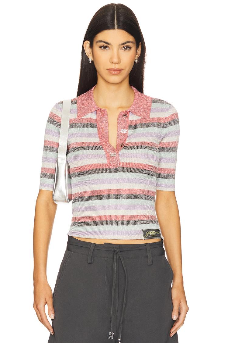 Midweight metallic knit and a fitted silhouette define this striped polo top with half sleeves and a classic polo collar. The waist-length cut complements its casual chic vibe, while subtle sparkle sequins add a modern, trendy edge. Perfect for spring, summer, or autumn, this versatile top suits casual outings, brunch dates, and even smart workwear settings. Its front partial button closure and all-over stripes blend style with comfort, making it a standout piece for everyday elegance.