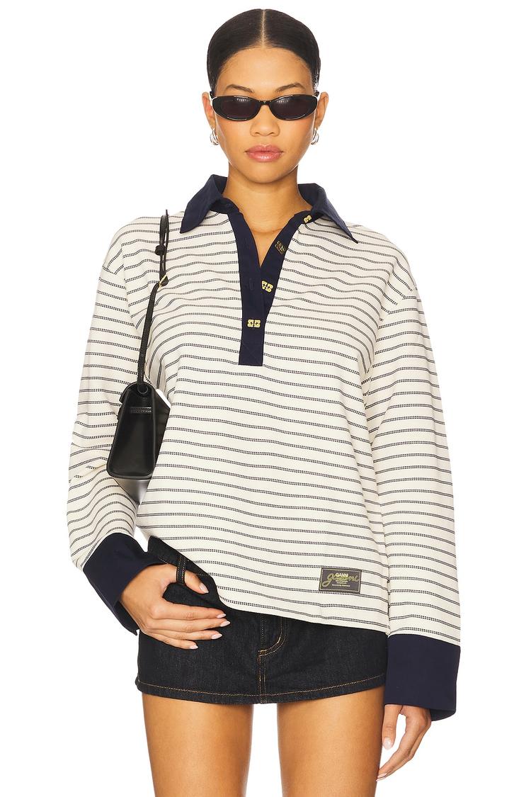 Classic striped polo crafted from midweight organic cotton piqué offers a timeless, versatile silhouette. This hip-length top features a structured polo collar and long sleeves with contrasting cuff details, delivering a polished yet casual vibe. The partial front gold-tone button closure adds a subtle luxe touch, while the relaxed regular fit ensures comfort for everyday wear. Ideal for casual outings, workwear layering, and travel, this minimalist piece blends functionality with effortless style across spring and autumn seasons.