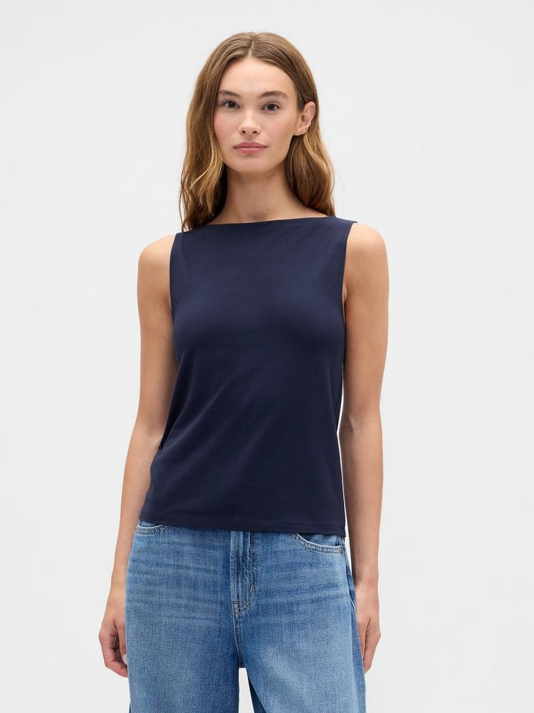 A timeless navy cotton tank top featuring a classic boat neck and sleeveless design for effortless layering or standalone wear. Its regular fit and hip length offer comfortable everyday versatility, ideal for casual outings, travel, or relaxed weekends. The minimalist solid navy silhouette pairs seamlessly with denim or shorts, making it a staple for warm spring and summer days.
