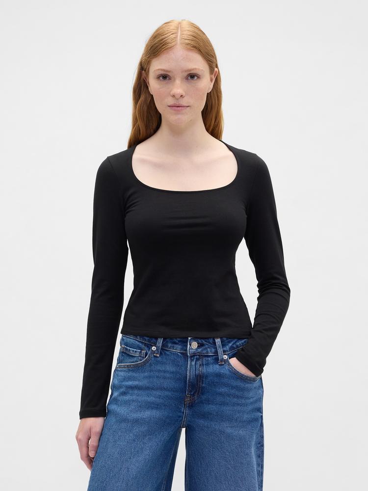 Classic elegance defines this fitted shell top crafted from comfortable jersey fabric. Featuring a flattering scoop neck and long regular sleeves, it offers a sleek silhouette that reaches hip length. The matte black shade complements its minimalist style, making it a versatile piece ideal for casual outings, everyday wear, or business casual settings. Easy to layer and comfortable to wear, this top combines simplicity with subtle sophistication for a timeless wardrobe essential.