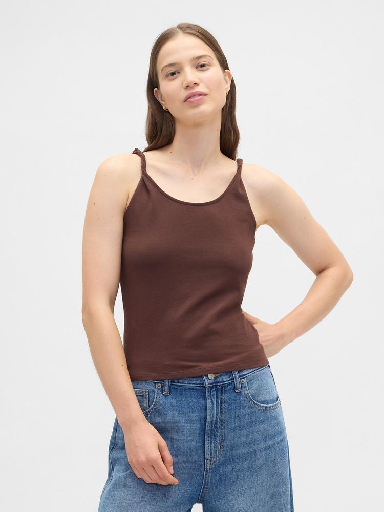 Soft matte brown jersey fabric shapes this fitted tank top with a scoop neckline and delicate spaghetti straps, hitting at waist length for a sleek silhouette. The minimalist design and comfortable stretch make it ideal for casual days, everyday wear, or vacation essentials. Its covered back and slip-on style add ease to its chic, laid-back appeal, perfect for spring and summer seasons.