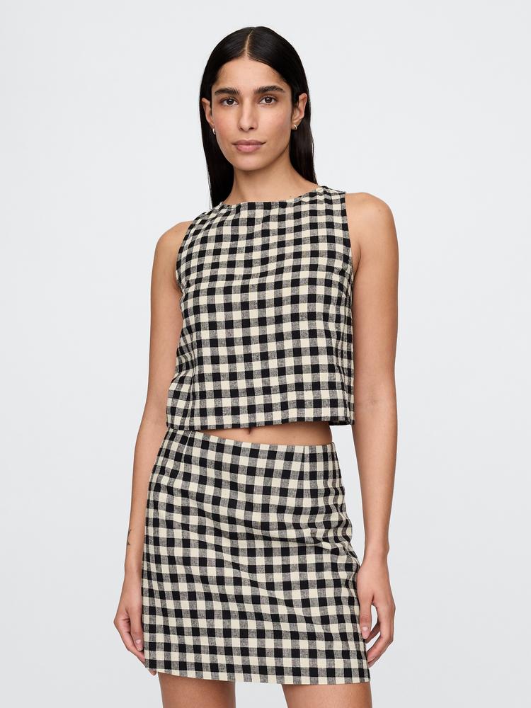 Classic checkered pattern meets breathable linen blend in this cropped shell tank top. Featuring a sleeveless design with a round neckline and regular fit, this pullover piece is perfect for casual outings, brunch dates, and everyday wear during spring and summer. The minimalist style and covered back create a clean, versatile silhouette that pairs effortlessly with high-waisted bottoms for a chic, laid-back vibe.